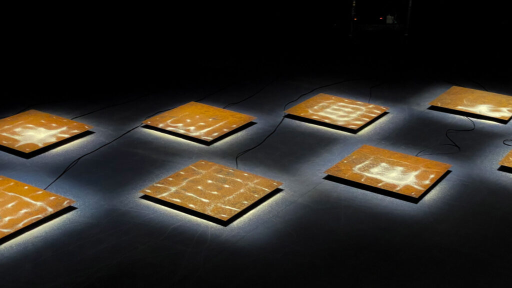 Im Konzert wird der Geigenbogen ersetzt, die 16 Eisenplatten werden mittels Elektronik zum Schwingen und Klingen angeregt. Plastisch kommt dies zur Erscheinung auf der Oberfläche der mit Sand bestreuten Eisenplatten in fließenden, dünenartigen Bewegungen, die der raumgreifenden musikalischen Gestaltung der Konzerte den Rahmen geben.